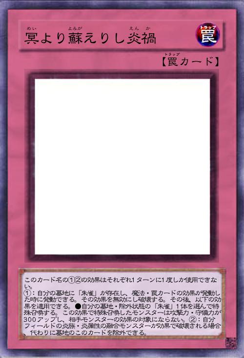| このカード名の①②の効果はそれぞれ1ターンに1度しか使用できない。 ①:自分の墓地に「朱雀」が存在し、魔法・罠カードの効果が発動した時に発動できる。その効果を無効にし破壊する。その後、以下の効果を適用できる。●自分の墓地・除外状態の「朱雀」1体を選んで特殊召喚する。この効果で特殊召喚したモンスターは攻撃力・守備力が300アップし、相手モンスターの効果の対象にならない。②:自分フィールドの炎族・炎属性の融合モンスターが効果で破壊される場合、代わりに墓地のこのカードを除外できる。 | |||