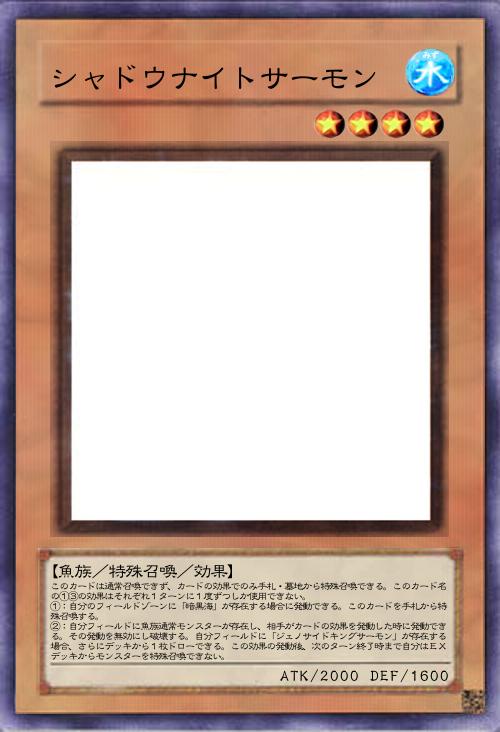| このカードは通常召喚できず、カードの効果でのみ手札・墓地から特殊召喚できる。このカード名の①③の効果はそれぞれ1ターンに1度ずつしか使用できない。 ①:自分のフィールドゾーンに「暗黒海」が存在する場合に発動できる。このカードを手札から特殊召喚する。 ②:自分フィールドに魚族通常モンスターが存在し、相手がカードの効果を発動した時に発動できる。その発動を無効にし破壊する。自分フィールドに「ジェノサイドキングサーモン」が存在する場合、さらにデッキから1枚ドローできる。この効果の発動後、次のターン終了時まで自分はEXデッキからモンスターを特殊召喚できない。 | |||