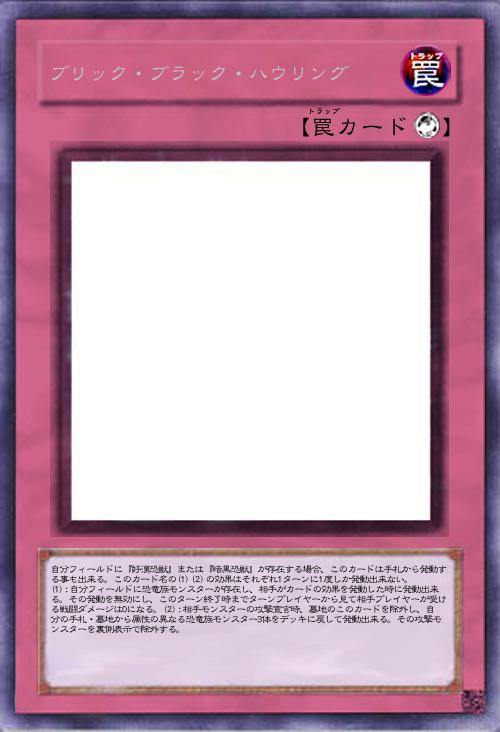 | 自分フィールドに『好漢恐獣』または『暗黒恐獣』が存在する場合、このカードは手札から発動する事も出来る。このカード名の(1)(2)の効果はそれぞれ1ターンに1度しか発動出来ない。 (1):自分フィールドに恐竜族モンスターが存在し、相手がカードの効果を発動した時に発動出来る。その発動を無効にし、このターン終了時までターンプレイヤーから見て相手プレイヤーが受ける戦闘ダメージは0になる。(2):相手モンスターの攻撃宣言時、墓地のこのカードを除外し、自分の手札・墓地から属性の異なる恐竜族モンスター3体をデッキに戻して発動出来る。その攻撃モンスターを裏側表示で除外する。 | |||