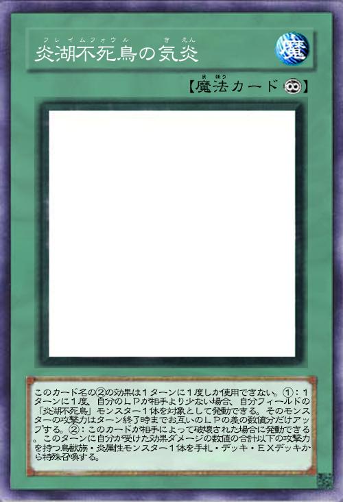 | このカード名の②の効果は1ターンに1度しか使用できない。①:1ターンに1度、自分のLPが相手より少ない場合、自分フィールドの「炎湖不死鳥」モンスター1体を対象として発動できる。そのモンスターの攻撃力はターン終了時までお互いのLPの差の数値分だけアップする。②:このカードが相手によって破壊された場合に発動できる。このターンに自分が受けた効果ダメージの数値の合計以下の攻撃力を持つ鳥獣族・炎属性モンスター1体を手札・デッキ・EXデッキから特殊召喚する。 | |||