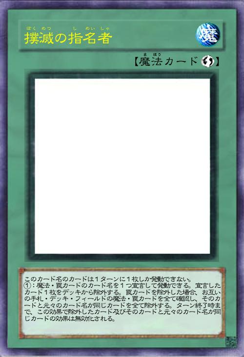 | このカード名のカードは1ターンに1枚しか発動できない。 ①:魔法・罠カードのカード名を1つ宣言して発動できる。宣言したカード1枚をデッキから除外する。罠カードを除外した場合、お互いの手札・デッキ・フィールドの魔法・罠カードを全て確認し、そのカードと元々のカード名が同じカードを全て除外する。ターン終了時まで、この効果で除外したカード及びそのカードと元々のカード名が同じカードの効果は無効化される。 | |||