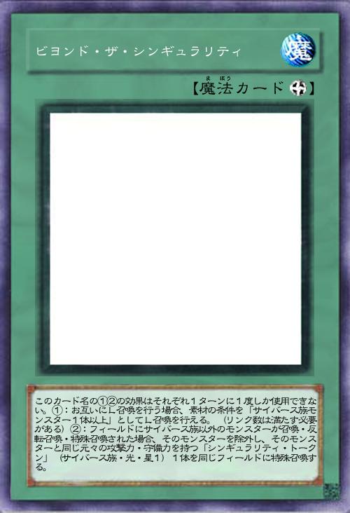 | このカード名の①②の効果はそれぞれ1ターンに1度しか使用できない。①:お互いにL召喚を行う場合、素材の条件を「サイバース族モンスター1体以上」としてL召喚を行える。(リンク数は満たす必要がある)②:フィールドにサイバース族以外のモンスターが召喚・反転召喚・特殊召喚された場合、そのモンスターを除外し、そのモンスターと同じ元々の攻撃力・守備力を持つ「シンギュラリティ・トークン」(サイバース族・光・星1)1体を同じフィールドに特殊召喚する。 | |||
