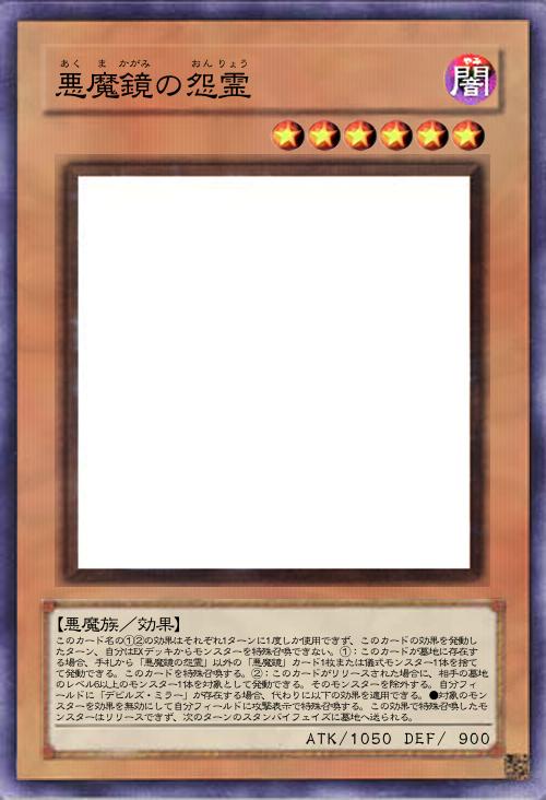 | このカード名の①②の効果はそれぞれ1ターンに1度しか使用できず、このカードの効果を発動したターン、自分はEXデッキからモンスターを特殊召喚できない。①:このカードが墓地に存在する場合、手札から「悪魔鏡の怨霊」以外の「悪魔鏡」カード1枚または儀式モンスター1体を捨てて発動できる。このカードを特殊召喚する。②:このカードがリリースされた場合に、相手の墓地のレベル6以上のモンスター1体を対象として発動できる。そのモンスターを除外する。自分フィールドに「デビルズ・ミラー」が存在する場合、代わりに以下の効果を適用できる。●対象のモンスターを効果を無効にして自分フィールドに攻撃表示で特殊召喚する。この効果で特殊召喚したモンスターはリリースできず、次のターンのスタンバイフェイズに墓地へ送られる。 | |||