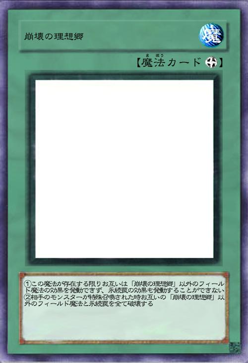 | ①この魔法が存在する限りお互いは「崩壊の理想郷」以外のフィールド魔法の効果を発動できず、永続罠の効果も発動することができない ②相手のモンスターが特殊召喚された時お互いの「崩壊の理想郷」以外のフィールド魔法と永続罠を全て破壊する | |||
