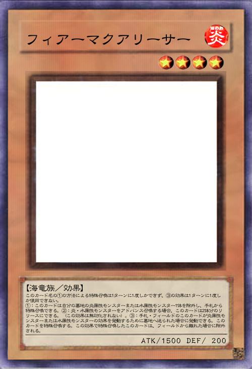 | このカード名の①の方法による特殊召喚は1ターンに1度しかできず、③の効果は1ターンに1度しか使用できない。 ①:このカードは自分の墓地の炎属性モンスターまたは水属性モンスター1体を除外し、手札から特殊召喚できる。②:炎・水属性モンスターをアドバンス召喚する場合、このカードは2体分のリリースにできる。(この効果は無効化されない)。③:手札・フィールドのこのカードが炎属性モンスターまたは水属性モンスターの効果を発動するために墓地へ送られた場合に発動できる。このカードを特殊召喚する。この効果で特殊召喚したこのカードは、フィールドから離れた場合に除外される。 | |||