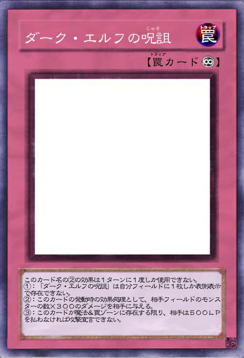 | このカード名の②の効果は1ターンに1度しか使用できない。 ①:「ダーク・エルフの呪詛」は自分フィールドに1枚しか表側表示で存在できない。 ②:このカードの発動時の効果処理として、相手フィールドのモンスターの数×300のダメージを相手に与える。 ③:このカードが魔法&罠ゾーンに存在する限り、相手は500LPを払わなければ攻撃宣言できない。 | |||