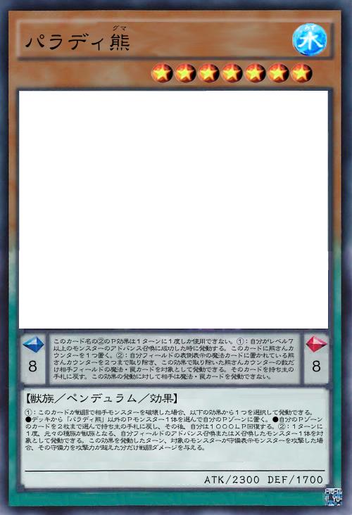 | ①:このカードが戦闘で相手モンスターを破壊した場合、以下の効果から1つを選択して発動できる。 ●デッキから「パラディ熊」以外のPモンスター1体を選んで自分のPゾーンに置く。●自分のPゾーンのカードを2枚まで選んで持ち主の手札に戻し、その後、自分は1000LP回復する。②:1ターンに1度、元々の種族が獣族となる、自分フィールドのアドバンス召喚またはX召喚したモンスター1体を対象として発動できる。この効果を発動したターン、対象のモンスターが守備表示モンスターを攻撃した場合、その守備力を攻撃力が超えた分だけ戦闘ダメージを与える。 | |||
