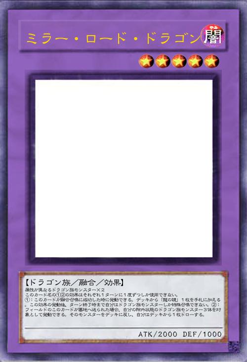 | 属性が異なるドラゴン族モンスター×2 このカード名の①②の効果はそれぞれ1ターンに1度ずつしか使用できない。 ①:このカードが融合召喚に成功した時に発動できる。デッキから「龍の鏡」1枚を手札に加える。この効果の発動後、ターン終了時まで自分はドラゴン族モンスターしか特殊召喚できない。②:フィールドのこのカードが墓地へ送られた場合、自分の除外状態のドラゴン族モンスター3体を対象として発動できる。そのモンスターをデッキに戻し、自分はデッキから1枚ドローする。 | |||
