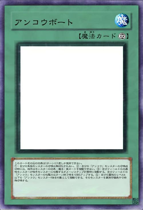 | このカード名の④の効果は1ターンに1度しか使用できない。 ①:自分の魚族モンスターの召喚は無効化されない。②:自分の「アンコウ」モンスターの召喚成功時には、相手はモンスターの効果・魔法・罠カードを発動できない。③:自分フィールドの水属性モンスターが相手モンスターに攻撃するダメージステップ計算時に発動する。自分フィールドの「アンコウ」モンスターの攻撃力はターン終了時まで300アップする。④:自分の墓地のレベル4以下の「アンコウ」モンスター1体を対象として発動できる。そのモンスターを裏側守備表示で特殊召喚する。 | |||