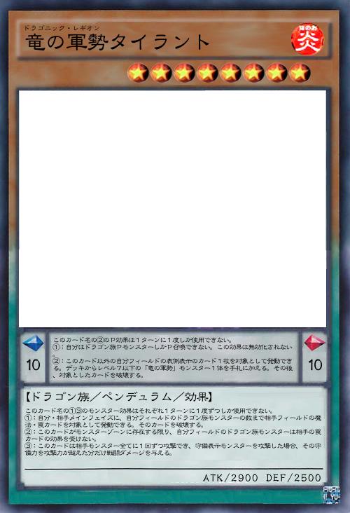 | このカード名の②のP効果は1ターンに1度しか使用できない。 ①:自分はドラゴン族PモンスターしかP召喚できない。この効果は無効化されない。 ②:このカード以外の自分フィールドの表側表示のカード1枚を対象として発動できる。デッキからレベル7以下の「竜の軍勢」モンスター1体を手札に加える。その後、対象としたカードを破壊する。 | |||