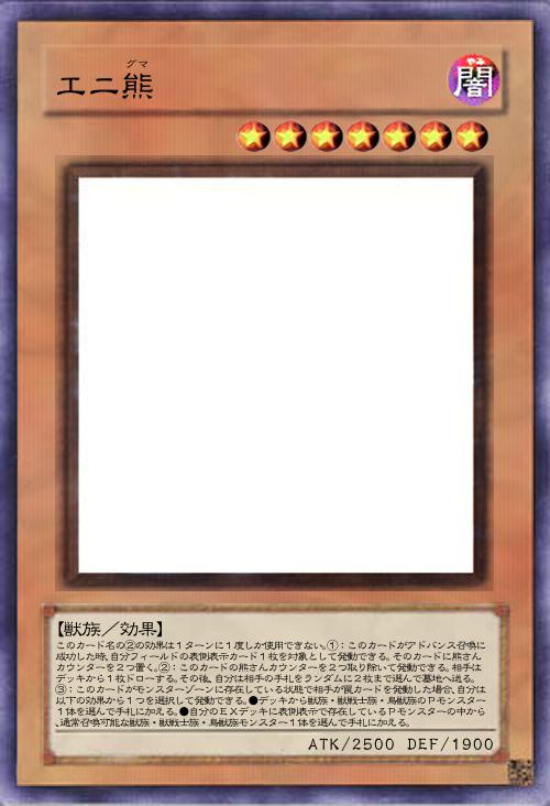 | このカード名の②の効果は1ターンに1度しか使用できない。①:このカードがアドバンス召喚に成功した時、自分フィールドの表側表示カード1枚を対象として発動できる。そのカードに熊さんカウンターを2つ置く。②:このカードの熊さんカウンターを2つ取り除いて発動できる。相手はデッキから1枚ドローする。その後、自分は相手の手札をランダムに2枚まで選んで墓地へ送る。③:このカードがモンスターゾーンに存在している状態で相手が罠カードを発動した場合、自分は以下の効果から1つを選択して発動できる。●デッキから獣族・獣戦士族・鳥獣族のPモンスター1体を選んで手札に加える。●自分のEXデッキに表側表示で存在しているPモンスターの中から、通常召喚可能な獣族・獣戦士族・鳥獣族モンスター1体を選んで手札に加える。 | |||
