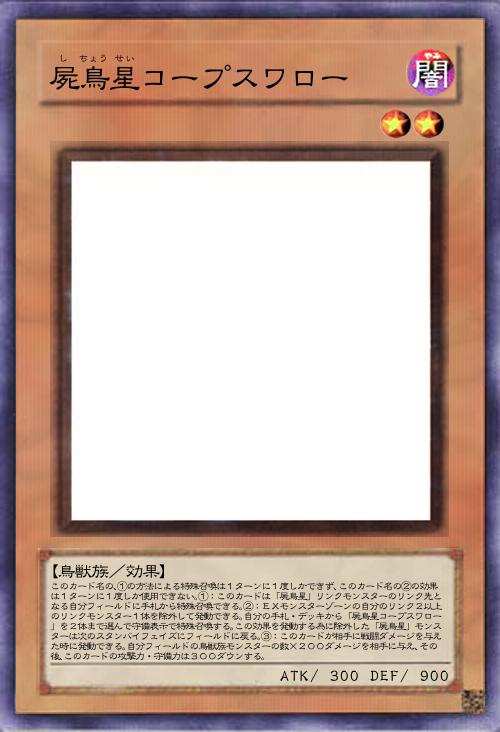 | このカード名の、①の方法による特殊召喚は1ターンに1度しかできず、このカード名の②の効果は1ターンに1度しか使用できない。①:このカードは「屍鳥星」リンクモンスターのリンク先となる自分フィールドに手札から特殊召喚できる。②:EXモンスターゾーンの自分のリンク2以上のリンクモンスター1体を除外して発動できる。自分の手札・デッキから「屍鳥星コープスワロー」を2体まで選んで守備表示で特殊召喚する。この効果を発動する為に除外した「屍鳥星」モンスターは次のスタンバイフェイズにフィールドに戻る。③:このカードが相手に戦闘ダメージを与えた時に発動できる。自分フィールドの鳥獣族モンスターの数×200ダメージを相手に与え、その後、このカードの攻撃力・守備力は300ダウンする。 | |||