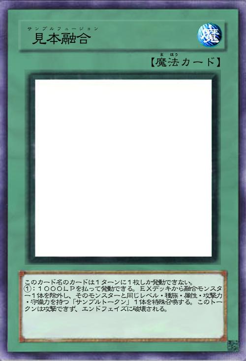 | このカード名のカードは1ターンに1枚しか発動できない。 ①:1000LPを払って発動できる。EXデッキから融合モンスター1体を除外し、そのモンスターと同じレベル・種族・属性・攻撃力・守備力を持つ「サンプルトークン」1体を特殊召喚する。このトークンは攻撃できず、エンドフェイズに破壊される。 | |||