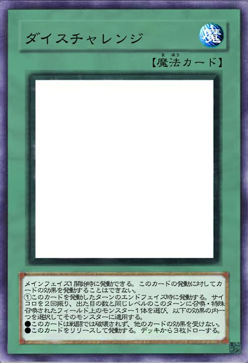 | メインフェイズ1開始時に発動できる。このカードの発動に対してカードの効果を発動することはできない。 ①このカードを発動したターンのエンドフェイズ時に発動する。サイコロを2回振り、出た目の数と同じレベルのこのターンに召喚・特殊召喚されたフィールド上のモンスター1体を選び、以下の効果の内一つを選択してそのモンスターに適用する。 ●このカードは戦闘では破壊されず、他のカードの効果を受けない。 ●このカードをリリースして発動する。デッキから3枚ドローする。 | |||
