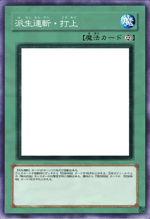 | 『派生連斬』カードは1ターンに1枚だけ発動出来る。 ①このカードの発動時にデッキから『武狭体術』カードを1枚手札に加える。②自分フィールド上の『無双武狭』モンスターの攻撃宣言時に発動出来る。墓地から『演武妖術』カードか 『武狭体術』カード1枚を手札に加える。 | |||