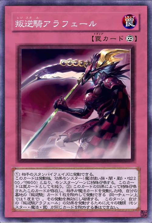| ①:相手のスタンバイフェイズに発動できる。 このカードは発動後、効果モンスター(魔法使い族・闇・星6・攻2200/守900)となり、モンスターゾーンに特殊召喚する。このカードは罠カードとしても扱う。②:このカードの効果によって特殊召喚されたこのカードが存在し、相手が魔法カードを発動した時、自分の墓地の「叛逆騎」カード1枚を除外して発動できる(同一チェーン上では1度まで)。その発動を無効にし破壊する。 このターン、自分の「叛逆騎アラフェール」の効果を発動するために元々の種類(モンスター・魔法・罠)が同じカードを除外する事はできない。 | |||