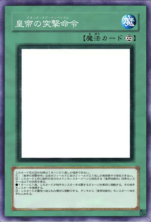 | このカード名の③の効果は1ターンに1度しか使用できない。 ①:「皇帝の突撃命令」は自分フィールドに自分フィールドに1枚しか表側表示で存在できない。 ②:このカードと同じ縦列の自分のメインモンスターゾーンに存在する「皇帝近衛兵」効果モンスターは以下の効果を得る。 ●1ターンに1度、このカードが相手モンスターを攻撃するダメージ計算前に発動する。その相手モンスターを破壊する。 ③:このカードが墓地へ送られた場合に発動できる。デッキから「皇帝近衛兵」モンスター1体を手札に加える。 | |||