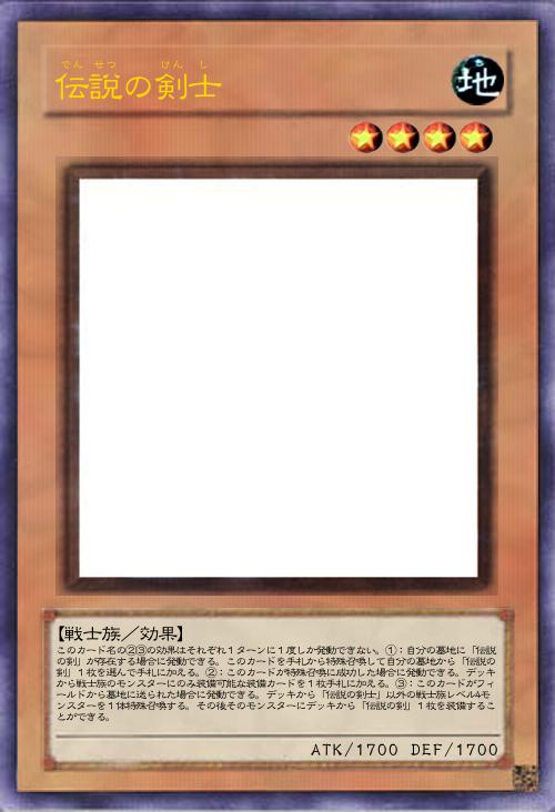 | このカード名の②③の効果はそれぞれ1ターンに1度しか発動できない。①:自分の墓地に「伝説の剣」が存在する場合に発動できる。このカードを手札から特殊召喚して自分の墓地から「伝説の剣」1枚を選んで手札に加える。②:このカードが特殊召喚に成功した場合に発動できる。デッキから戦士族のモンスターにのみ装備可能な装備カードを1枚手札に加える。③:このカードがフィールドから墓地に送られた場合に発動できる。デッキから「伝説の剣士」以外の戦士族レベル4モンスターを1体特殊召喚する。その後そのモンスターにデッキから「伝説の剣」1枚を装備することができる。 | |||