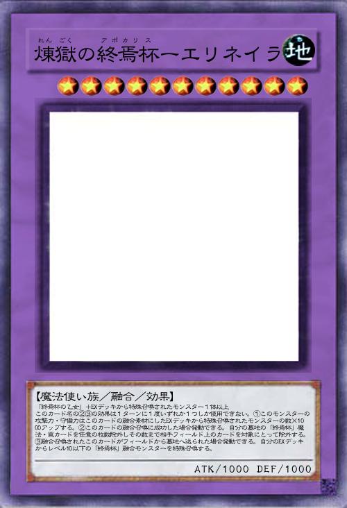 | 「終焉杯の乙女」+EXデッキから特殊召喚されたモンスター1体以上 このカード名の②③の効果は1ターンに1度いずれか1つしか使用できない。①このモンスターの攻撃力・守備力はこのカードの融合素材にしたEXデッキから特殊召喚されたモンスターの数×1000アップする。②このカードの融合召喚に成功した場合発動できる。自分の墓地の「終焉杯」魔法・罠カードを任意の枚数除外しその数まで相手フィールド上のカードを対象にとって除外する。③融合召喚されたこのカードがフィールドから墓地へ送られた場合発動できる。自分のEXデッキからレベル10以下の「終焉杯」融合モンスターを特殊召喚する。 | |||