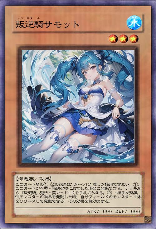 | このカード名の① ②の効果は1ターンに1度しか使用できない。①:このカードが召喚・特殊召喚に成功した場合に発動できる。デッキから「叛逆騎」魔法・罠カード1枚を手札に加える。② :相手が炎属性モンスターの効果を発動した時、自分フィールドのモンスター1体をリリースして発動できる。その効果を無効にする。 | |||