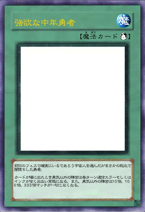| 前回のフェスで確実にいるであろう宇宙人を選んだがまさかの敗北で闇堕ちした勇者。 カードが場に出たとき勇気以外の陣営は毎ターン通信エラーもしくはインクが全く出ない常態になる。また、勇気以外の陣営は10倍、100倍、333倍マッチが一切こなくなる。 | |||
