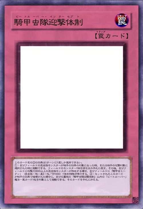 | このカード名の②の効果は1ターンに1度しか使用できない。 ①:自分フィールドの昆虫族モンスターが相手の効果の対象になった時、または相手の攻撃対象に選択された時に発動できる。フィールドのモンスター1体を持ち主の手札に戻す。その後、自分フィールドに攻撃力3000以上の昆虫族モンスターが存在する場合、自分フィールドに「騎甲虫トークン」(昆虫族・地・星3・攻/守1000)1体を特殊召喚できる。②:セットされたこのカードが相手の効果で破壊された場合に、自分の墓地の「騎甲虫隊迎撃体制」以外の「ビートルーパー」魔法・罠カード1枚を対象として発動できる。そのカードを手札に加える。 | |||