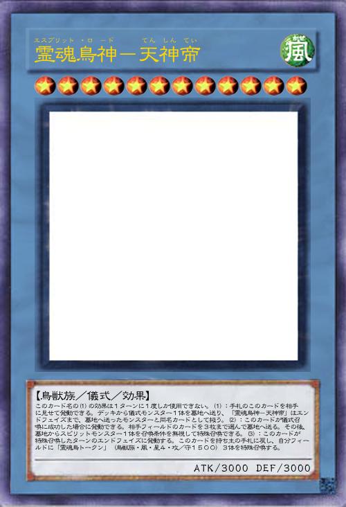 | このカード名の(1)の効果は1ターンに1度しか使用できない。(1):手札のこのカードを相手に見せて発動できる。デッキから儀式モンスター1体を墓地へ送り、「霊魂鳥神-天神帝」はエンドフェイズまで、墓地へ送ったモンスターと同名カードとして扱う。(2):このカードが儀式召喚に成功した場合に発動できる。相手フィールドのカードを3枚まで選んで墓地へ送る。その後、墓地からスピリットモンスター1体を召喚条件を無視して特殊召喚できる。(3):このカードが特殊召喚したターンのエンドフェイズに発動する。このカードを持ち主の手札に戻し、自分フィールドに「霊魂鳥トークン」(鳥獣族・風・星4・攻/守1500)3体を特殊召喚する。 | |||