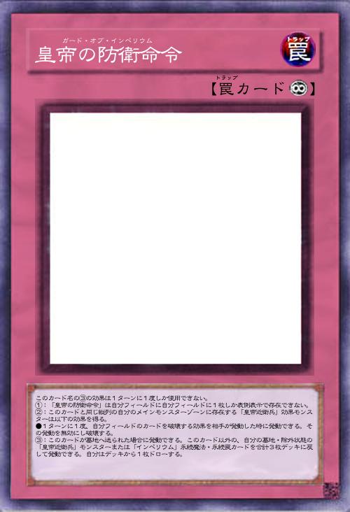 | このカード名の③の効果は1ターンに1度しか使用できない。 ①:「皇帝の防衛命令」は自分フィールドに自分フィールドに1枚しか表側表示で存在できない。 ②:このカードと同じ縦列の自分のメインモンスターゾーンに存在する「皇帝近衛兵」効果モンスターは以下の効果を得る。 ●1ターンに1度、自分フィールドのカードを破壊する効果を相手が発動した時に発動できる。その発動を無効にし破壊する。 ③:このカードが墓地へ送られた場合に発動できる。このカード以外の、自分の墓地・除外状態の「皇帝近衛兵」モンスターまたは「インペリウム」永続魔法・永続罠カードを合計3枚デッキに戻して発動できる。自分はデッキから1枚ドローする。 | |||