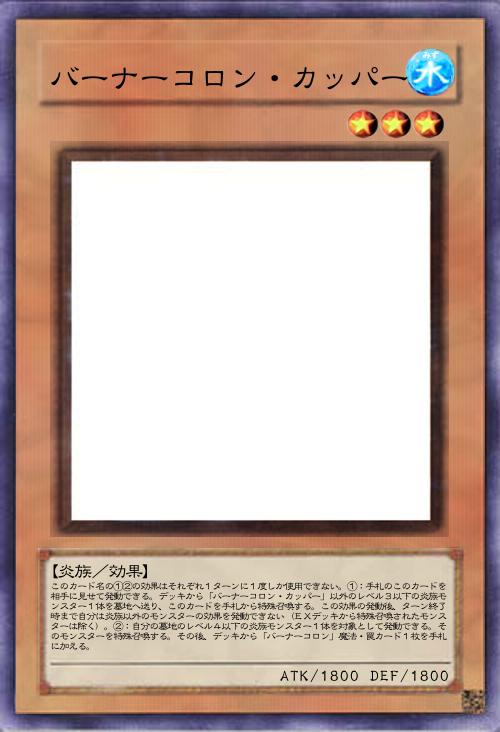 | このカード名の①②の効果はそれぞれ1ターンに1度しか使用できない。①:手札のこのカードを相手に見せて発動できる。デッキから「バーナーコロン・カッパー」以外のレベル3以下の炎族モンスター1体を墓地へ送り、このカードを手札から特殊召喚する。この効果の発動後、ターン終了時まで自分は炎族以外のモンスターの効果を発動できない(EXデッキから特殊召喚されたモンスターは除く)。②:自分の墓地のレベル4以下の炎族モンスター1体を対象として発動できる。そのモンスターを特殊召喚する。その後、デッキから「バーナーコロン」魔法・罠カード1枚を手札に加える。 | |||