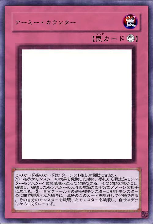 | このカード名のカードは1ターンに1枚しか発動できない。 ①:相手がモンスターの効果を発動した時に、手札から戦士族モンスターモンスター1体を墓地へ送って発動できる。その発動を無効にし破壊し、破壊したモンスターの元々の攻撃力の半分のダメージを相手に与える。②:自分フィールドの戦士族モンスターが相手モンスターの攻撃で破壊された場合に、墓地のこのカードを除外して発動できる。その自分のモンスターを破壊したモンスターを破壊し、自分はデッキから1枚ドローする。 | |||