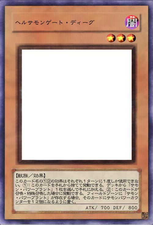継承されし記憶(真DM2)には、自身がフィールドで表側表示になった時に召喚パワーをMAXの12にすることができる能力を持つモンスターとして《ヘルゲート・ディーグ》と《バフォメット》が存在しており、これはレベルとコストが低くより使いやすい《ヘルゲート・ディーグ》のリメイクとなります。