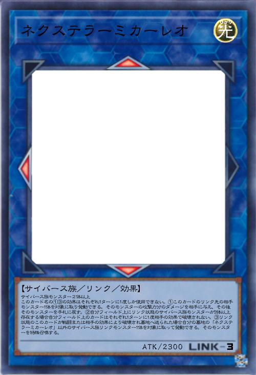 | サイバース族モンスター2体以上 このカード名の①③の効果はそれぞれ1ターンに1度しか使用できない。①このカードのリンク先の相手モンスター1体を対象に取り発動できる。そのモンスターの攻撃力分のダメージを相手に与え、その後そのモンスターを手札に戻す。②自分フィールド上にリンク状態のサイバース族モンスターが3体以上存在する場合自分フィールド上のカードはそれぞれ1ターンに1度相手の効果で破壊されない。③リンク状態のこのカードが戦闘または相手の効果により破壊され墓地へ送られた場合自分の墓地の「ネクステラーミカーレオ」以外のサイバース族リンクモンスター1体を対象に取って発動できる。そのモンスターを特殊召喚する。 | |||