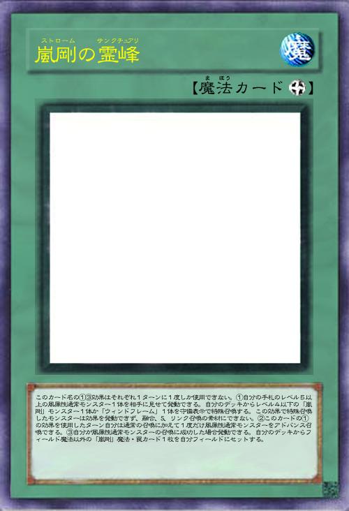 | このカード名の①③効果はそれぞれ1ターンに1度しか使用できない。①自分の手札のレベル5以上の風属性通常モンスター1体を相手に見せて発動できる。自分のデッキからレベル4以下の「嵐剛」モンスター1体か「ウィンドフレーム」1体を守備表示で特殊召喚する。この効果で特殊召喚したモンスターは効果を発動できず、融合、S、リンク召喚の素材にできない。②このカードの①の効果を使用したターン自分は通常の召喚に加えて1度だけ風属性通常モンスターをアドバンス召喚できる。③自分が風属性通常モンスターの召喚に成功した場合発動できる。自分のデッキからフィールド魔法以外の「嵐剛」魔法・罠カード1枚を自分フィールドにセットする。 | |||