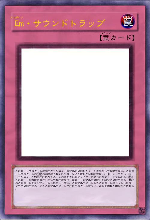| このカード名のカードは相手がモンスターの効果を発動したターン手札からも発動できる。このカード名のカードの①②の効果はそれぞれ1ターンに1度しか発動できない。①:デッキから「Em」モンスター1体を手札に加える。その後お互いのプレイヤーに2000ダメージを与える。②:このカードが墓地に存在していて相手が魔法・罠カードの効果を発動した場合に発動できる。墓地のこのカードを自分フィールドにセットする。この効果でセットしたこのカードはセットしたターンでも発動できる。またこの効果でセットされたこのカードはフィールドを離れた場合除外される。 | |||