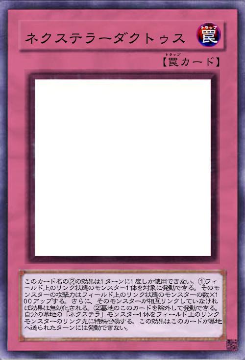| このカード名の②の効果は1ターンに1度しか使用できない。①フィールド上のリンク状態のモンスター1体を対象に発動できる。そのモンスターの攻撃力はフィールド上のリンク状態のモンスターの数×100アップする。さらに、そのモンスターが相互リンクしていなければ効果は無効化される。②墓地のこのカードを除外して発動できる。自分の墓地の「ネクステラ」モンスター1体をフィールド上のリンクモンスターのリンク先に特殊召喚する。この効果はこのカードが墓地へ送られたターンには発動できない。 | |||