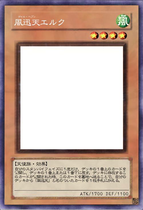| 自分のスタンバイフェイズに1度だけ、デッキの1番上のカードを公開し、デッキの1番上または1番下に戻す。デッキに存在するこのカードが公開された時、このカードを墓地へ送ることで、自分のデッキから「風迅天」と名のついたカードを1枚手札に加える。 | |||