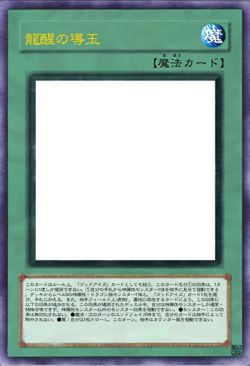 | このカードはルール上、「ゴッドアイズ」カードとしても扱う。このカード名の①の効果は、1ターンに1度しか使用できない。①自分の手札から神属性モンスター1体を相手に見せて発動できる。デッキからレベル9の神属性・ドラゴン族モンスター1体と、「ゴッドアイズ」カード1枚を選び、手札に加える。また、相手フィールド上(表側)、墓地に存在するカードにより、この効果に以下の効果が追加される。この効果が適用されたデュエル中、自分は神属性モンスターしか通常・特殊召喚できず、神属性モンスター以外のモンスター効果を発動できない。●モンスター:この効果は無効化されない。●魔法:次のターンのエンドフェイズ時まで、自分のカードは相手によって除外されない。●罠:自分は1枚ドローし、このターン、相手はカウンター罠を発動できない。 | |||