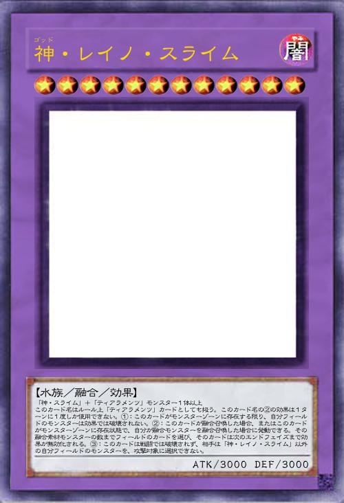 | 「神・スライム」+「ティアラメンツ」モンスター1体以上 このカード名はルール上「ティアラメンツ」カードとしても扱う。このカード名の②の効果は1ターンに1度しか使用できない。①:このカードがモンスターゾーンに存在する限り、自分フィールドのモンスターは効果では破壊されない。②:このカードが融合召喚した場合、またはこのカードがモンスターゾーンに存在状態で、自分が融合モンスターを融合召喚した場合に発動できる。その融合素材モンスターの数までフィールドのカードを選び、そのカードは次のエンドフェイズまで効果が無効化される。③:このカードは戦闘では破壊されず、相手は「神・レイノ・スライム」以外の自分フィールドのモンスターを、攻撃対象に選択できない。 | |||