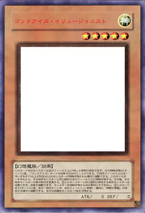 | このカード名のモンスターは自分フィールド上に1体しか表側で存在できず、その特殊召喚は1ターンに1度、「ゴッドアイズ」カードの効果でのみ行うことができる。①相手フィールド上に攻・守いずれか1つ以上が2000以上のモンスターが特殊召喚された場合に発動できる。このモンスターを手札から、その相手モンスターと同じ縦列の自分フィールド上に特殊召喚する。その後、その相手モンスターの表示形式を変更する。②このモンスターと同じ縦列に存在する相手モンスターは攻撃できず、効果も発動できず、モンスターを特殊召喚する為の素材にもできない。③このカード名で1ターンに1度、自分・相手ターン中、自分フィールド上(表側)・墓地に「神眼の零龍」が存在する場合に発動できる。自分は神属性モンスター1体を召喚する。 | |||