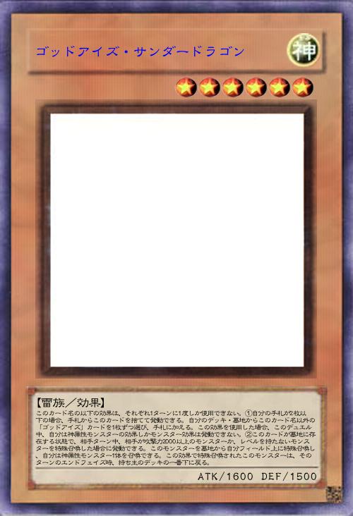 | このカード名の以下の効果は、それぞれ1ターンに1度しか使用できない。①自分の手札が2枚以下の場合、手札からこのカードを捨てて発動できる。自分のデッキ・墓地からこのカード名以外の「ゴッドアイズ」カードを1枚ずつ選び、手札に加える。この効果を使用した場合、このデュエル中、自分は神属性モンスターの効果しかモンスター効果は発動できない。②このカードが墓地に存在する状態で、相手ターン中、相手が攻撃力2000以上のモンスターか、レベルを持たないモンスターを特殊召喚した場合に発動できる。このモンスターを墓地から自分フィールド上に特殊召喚し、自分は神属性モンスター1体を召喚できる。この効果で特殊召喚されたこのモンスターは、そのターンのエンドフェイズ時、持ち主のデッキの一番下に戻る。 | |||