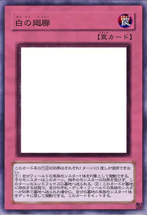 | このカード名の①②の効果はそれぞれ1ターンに1度しか使用できない。 ①:自分フィールドの魚族モンスター1体を対象として発動できる。そのモンスターはこのターン、相手のモンスターの効果を受けず、このターンのエンドフェイズに墓地へ送られる。②:このカードが墓地に存在する状態で、自分の手札・デッキ・フィールドの魚族モンスターが効果で墓地へ送られた場合に、自分の墓地の魚族モンスター1体をデッキに戻して発動できる。このカードをセットする。 | |||