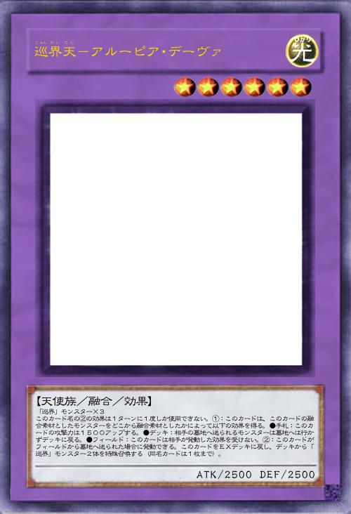 | 「巡界」モンスター×3 このカード名の②の効果は1ターンに1度しか使用できない。①:このカードは、このカードの融合素材としたモンスターをどこから融合素材としたかによって以下の効果を得る。●手札:このカードの攻撃力は1500アップする。●デッキ:相手の墓地へ送られるモンスターは墓地へは行かずデッキに戻る。●フィールド:このカードは相手が発動した効果を受けない。②:このカードがフィールドから墓地へ送られた場合に発動できる。このカードをEXデッキに戻し、デッキから「巡界」モンスター2体を特殊召喚する(同名カードは1枚まで)。 | |||
