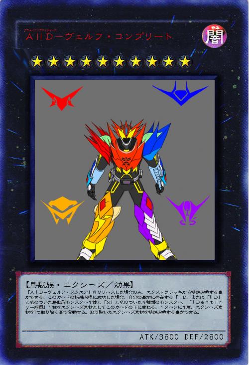 | 「AⅠD-ヴェルフ・スクエア」をリリースした場合のみ、エクストラデッキから特殊召喚する事ができる。このカードの特殊召喚に成功した場合、自分の墓地に存在する「ⅠD」または「ⅡD」と名のついた鳥獣族モンスター1体と「S」と名のついた4種類のモンスター、「ⅠDentify-疾風」1枚をエクシーズ素材としてこのカードの下に重ねる。1ターンに1度、エクシーズ素材を1つ取り除く事で発動する。取り除いたエクシーズ素材を特殊召喚する事ができる。 | |||