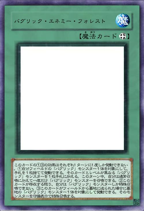 | このカードの①③の効果はそれぞれ1ターンに1度しか発動できない。①自分フィールドの「バグリック」モンスター1体を対象にして、手札を1枚捨てて発動できる。そのカードとレベルが異なる「バグリック」モンスターを1枚手札に加える。このターン中、自分は通常召喚に加えて一度だけ「バグリック」モンスターを召喚できる。②このカードが存在する限り、自分は「バグリック」モンスターしか特殊召喚できない。③このカードがフィールドから墓地に送られた場合に墓地の「バグリック」モンスター1体を対象にして発動できる。そのモンスターを守備表示で特殊召喚する。 | |||