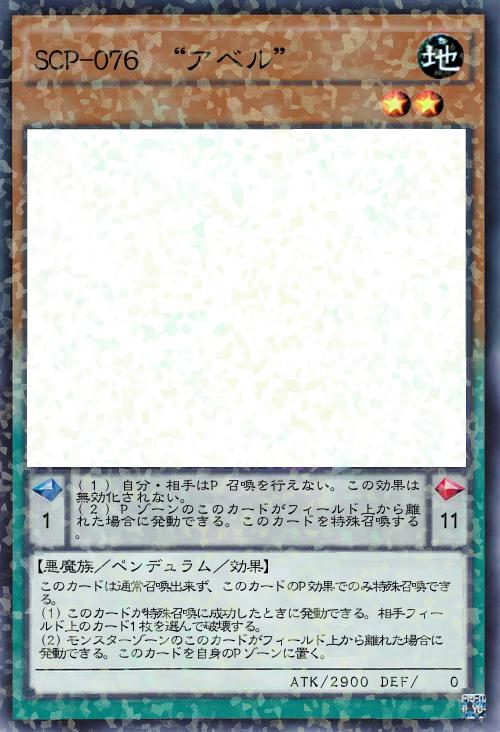 効果の方も棺(Pゾーン)から不定期に(フィールドから離れたら)出てきて殺戮(破壊)し、逆に殺戮(相手側からの破壊)し返したら封印(Pゾーン)されるという、SCP-076の特性を活かした効果になっていると思います!