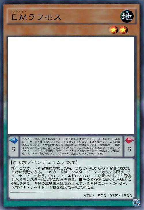 | このカード名の①のP効果は1ターンに1度しか使用できない。①:自分フィールドの「EM」または「ペンデュラム・ドラゴン」モンスター1体と相手フィールドの表側表示モンスター1体を対象として発動できる。対象のモンスターの攻撃力・守備力は300アップする。②:このカードがPゾーンに存在している状態で、自分が「スマイル・ワールド」を発動した時、1~9までの任意のPスケールを宣言して発動する。次のターン終了時まで、このカードは宣言したPスケールになる。 | |||