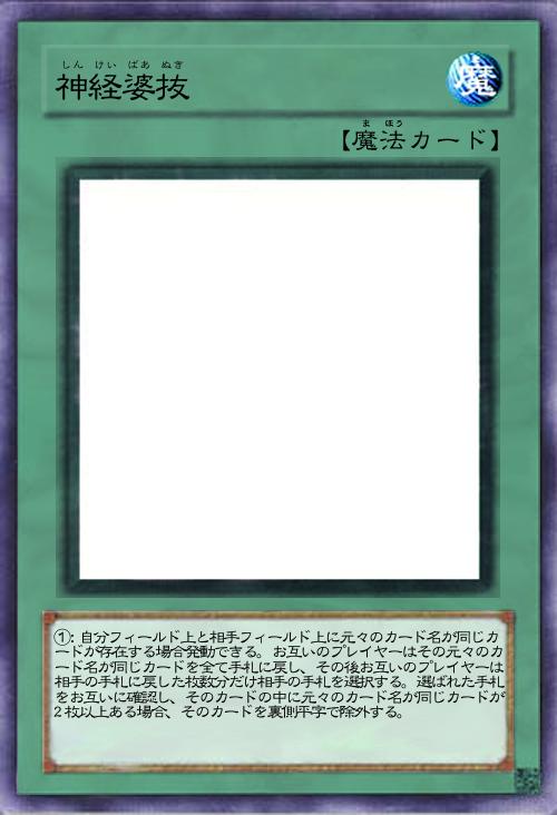 | ①:自分フィールド上と相手フィールド上に元々のカード名が同じカードが存在する場合発動できる。お互いのプレイヤーはその元々のカード名が同じカードを全て手札に戻し、その後お互いのプレイヤーは相手の手札に戻した枚数分だけ相手の手札を選択する。選ばれた手札をお互いに確認し、そのカードの中に元々のカード名が同じカードが2枚以上ある場合、そのカードを裏側平字で除外する。 | |||