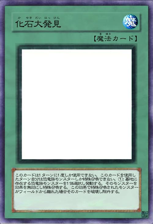 | このカードは1ターンに1度しか使用できない。このカードを使用したターン自分は恐竜族モンスターしか特殊召喚できない。①:墓地に存在する恐竜族モンスターを1体選択し発動する。そのモンスターを効果を無効にし特殊召喚する。この効果で特殊召喚されたモンスターがフィールドから離れた場合そのカードを破壊し除外される。 | |||