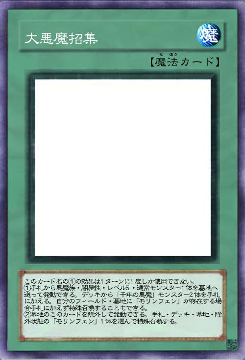 | このカード名の①の効果は1ターンに1度しか使用できない。 ①手札から悪魔族・闇属性・レベル5・通常モンスター1体を墓地へ送って発動できる。デッキから「千年の悪魔」モンスター2体を手札に加える。自分のフィールド・墓地に「モリンフェン」が存在する場合手札に加えず特殊召喚することもできる。 ②墓地のこのカードを除外して発動できる。手札・デッキ・墓地・除外状態の「モリンフェン」1体を選んで特殊召喚する。 | |||