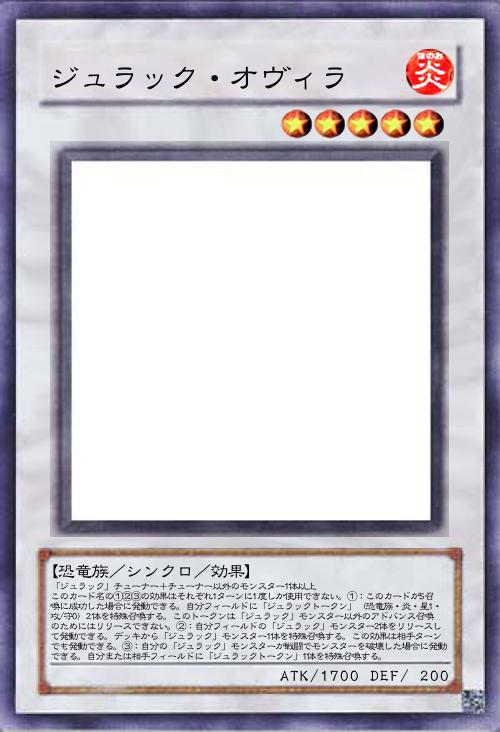| 「ジュラック」チューナー+チューナー以外のモンスター1体以上 このカード名の①②③の効果はそれぞれ1ターンに1度しか使用できない。①:このカードがS召喚に成功した場合に発動できる。自分フィールドに「ジュラックトークン」(恐竜族・炎・星1・攻/守0)2体を特殊召喚する。このトークンは「ジュラック」モンスター以外のアドバンス召喚のためにはリリースできない。②:自分フィールドの「ジュラック」モンスター2体をリリースして発動できる。デッキから「ジュラック」モンスター1体を特殊召喚する。この効果は相手ターンでも発動できる。③:自分の「ジュラック」モンスターが戦闘でモンスターを破壊した場合に発動できる。自分または相手フィールドに「ジュラックトークン」1体を特殊召喚する。 | |||
